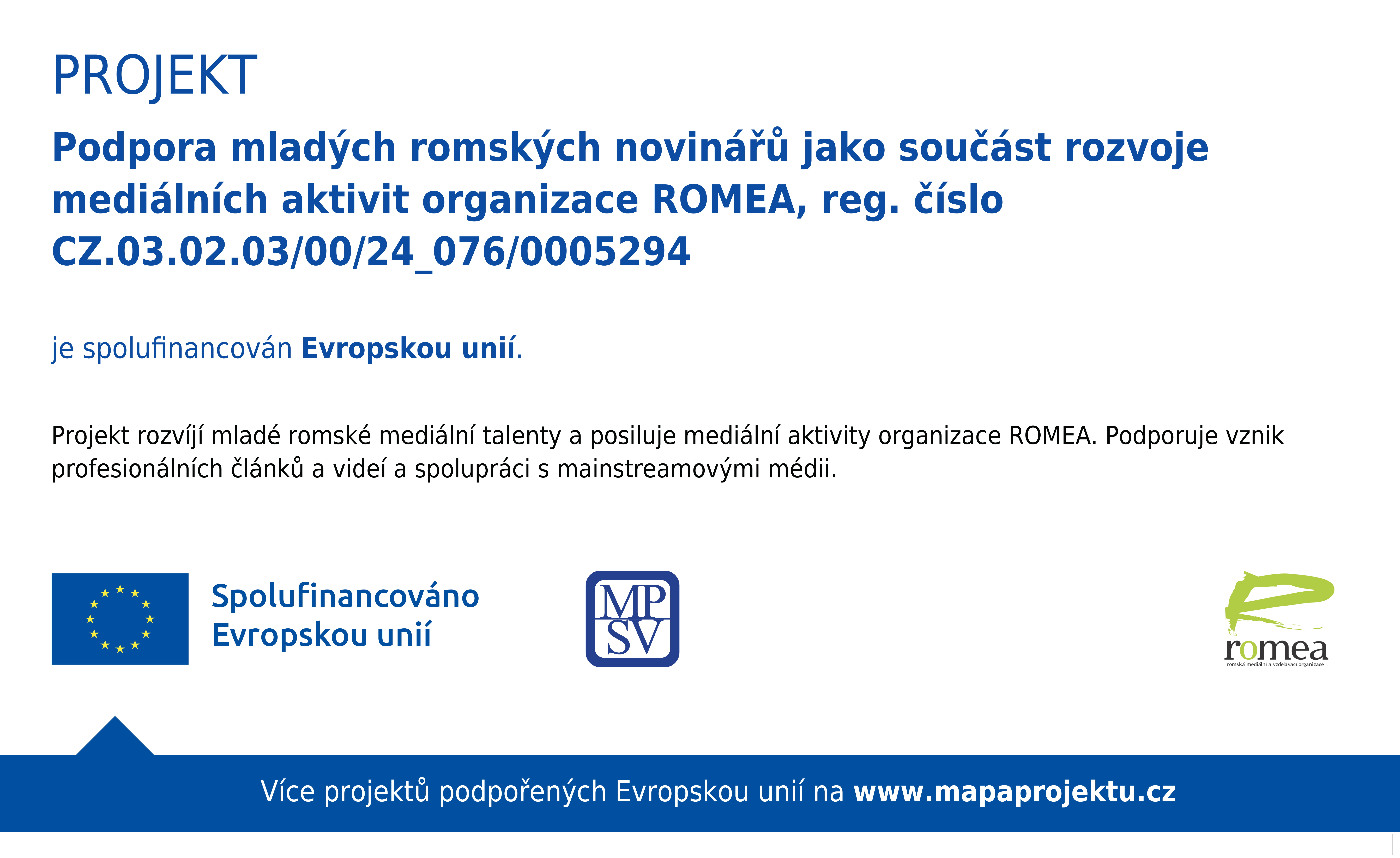 Projekt Podpora mladých romských novinářů jako součást rozvoje mediálních aktivit organizace ROMEA je realizován v rámci Operačního programu Zaměstnanost plus, výzvy 03_24_076 – Podpora integrace romské menšiny (2). Doba realizace projektu je od 1. července 2025 do 30. června 2027. Žadatelem projektu je ROMEA, o. p. s.