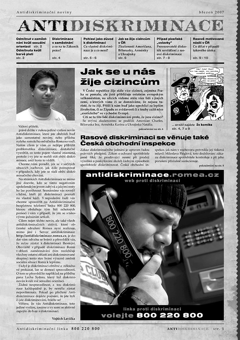 Témata publikace: diskriminace v zaměstnání kvůli sexuální orientaci, národnosti či pohlaví, rasová diskriminace, jak se žije cizincům v ČR, rasově motivované násilí v ČR